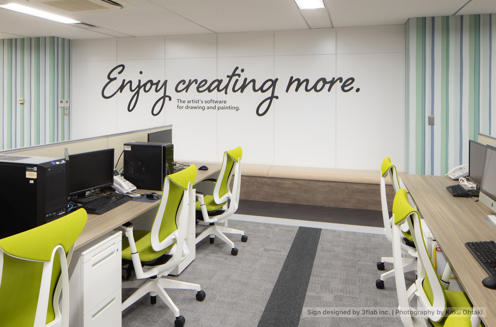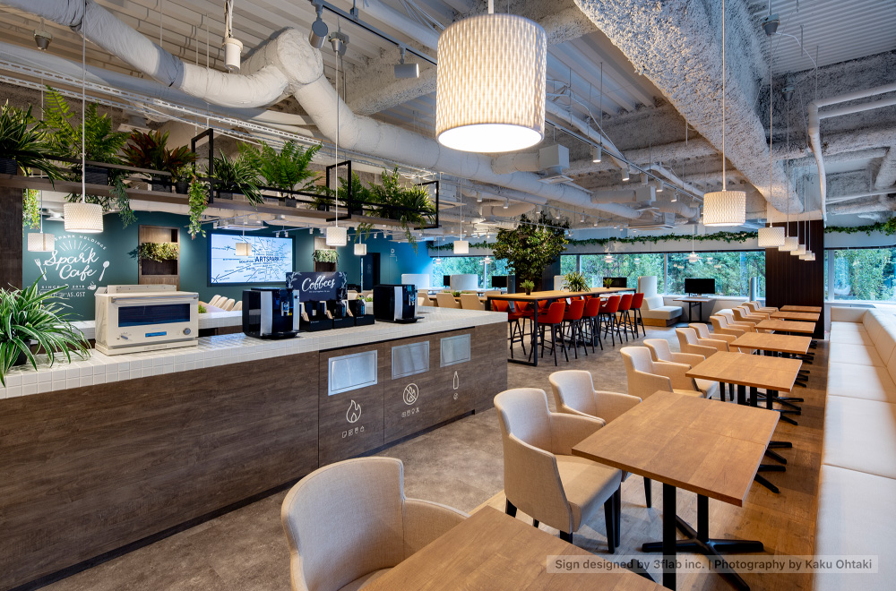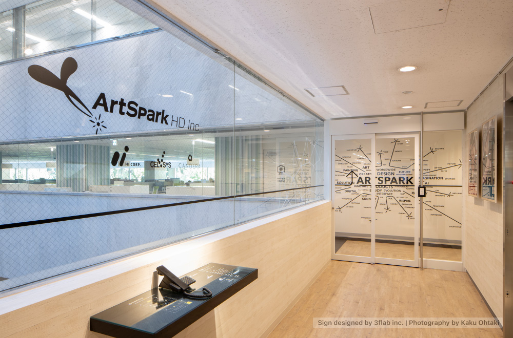 アートスパークホールディングス株式会社様のオフィスリニューアルに伴い、社内のサイン計画や壁に描かれたキービジュアル等をデザインさせていただきました。